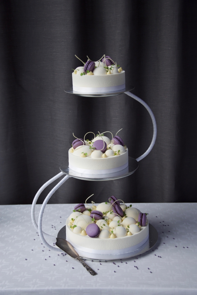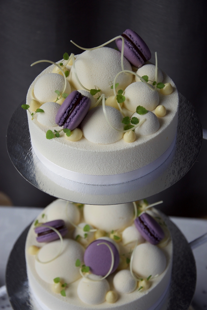Beskrivning: Frisk svartvinbärsbavaroise med kardemummamousse, brynt smör och citroncréme samt mandelbotten. Tårtan är sprayad med vit choklad och dekorerad med svartvinbärs macarons